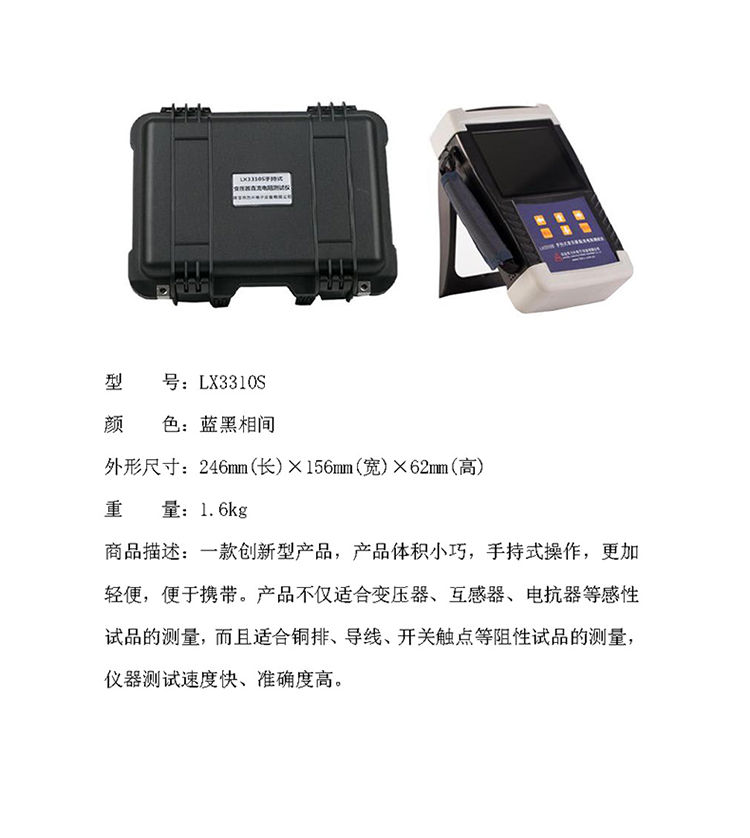 仪器不仅适合于变压器、互感器、电机等感性试品,还适用于铜排、导线、开关触点等阻性试品的测量,锂电池供电,交直流两用